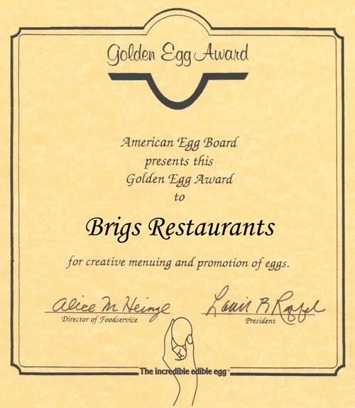 Brigs Restaurants were awarded the GOLDEN EGG AWARD by the American Egg Board for “creative menuing and promotion of eggs.” The award is only occasionally given to any restaurant. Brigs also had the pleasure of serving on the American Egg Board’s Foodservice Advisory Council for nearly a decade.