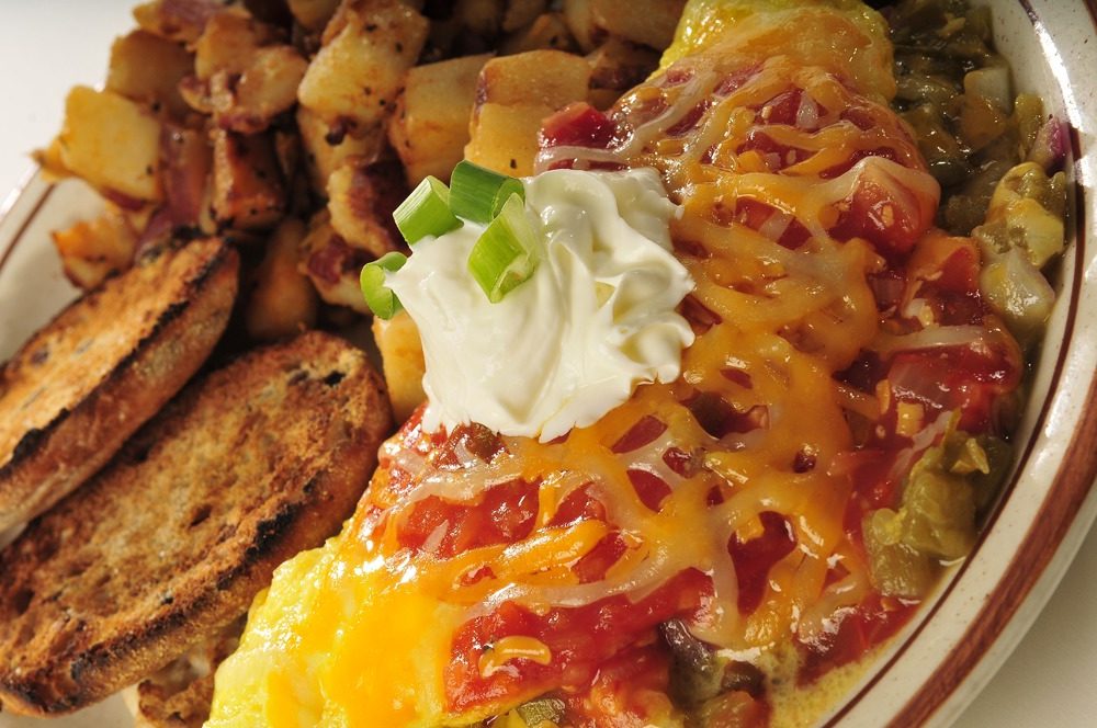 Filled with crisp bacon and two scrambled eggs* with cheddar-jack and served with homefries, grits or fresh fruit. 8.49